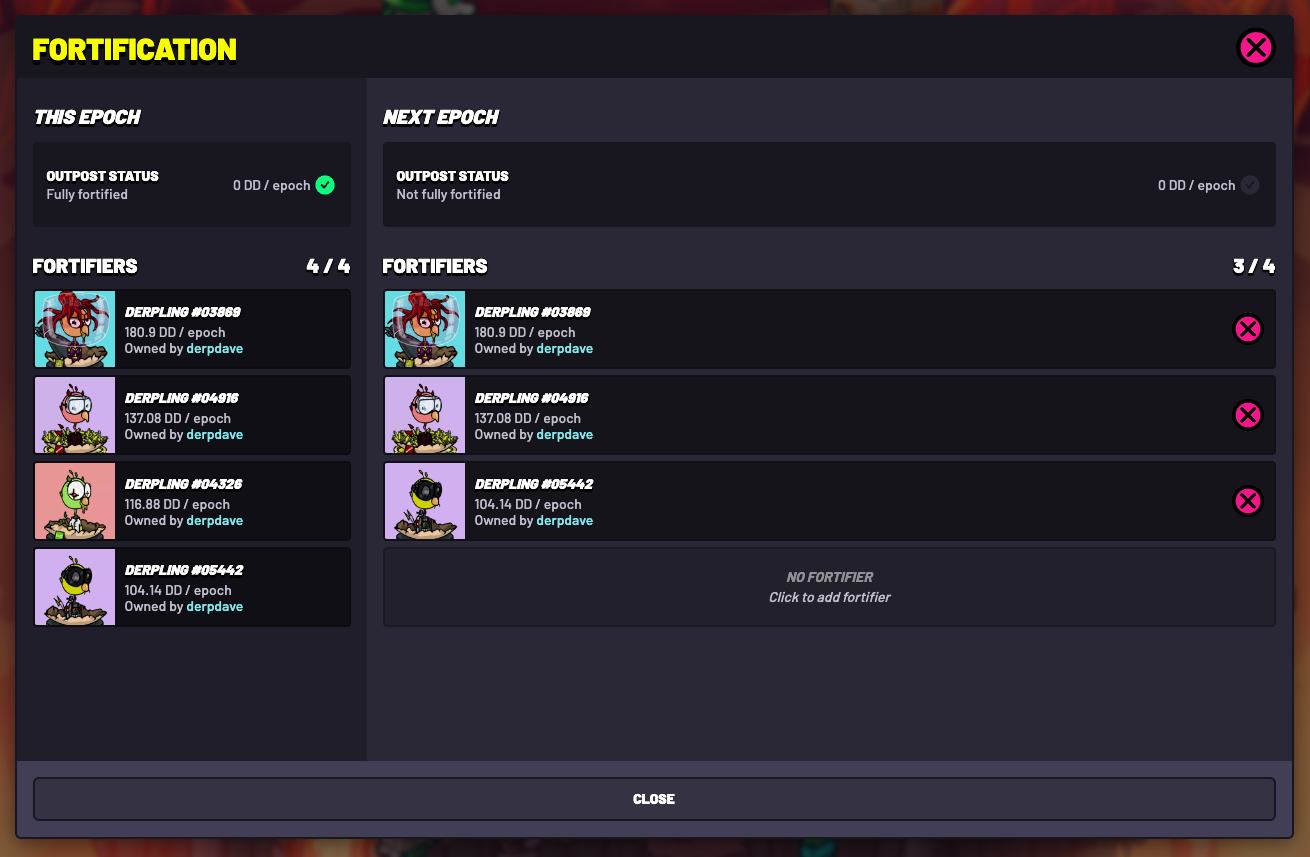 Each fortifier(a character fortifying an outpost) earns Derp Dollars each epoch. Each outpost can have up to 4 fortifiers. Once an outpost is fully fortified, it earns Derp Dollars every epoch.